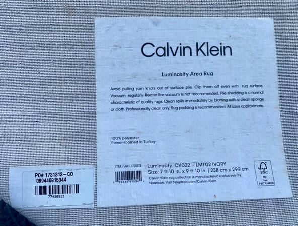 Online priced at $580 + tax; https://www.houzz.com/products/calvin-klein-ck024-irradiant-7-10-x-9-10-ivory-modern-indoor-area-rug-prvw-vr~196655609?m_refid=PLA_HZ_196655609_ show contact info
