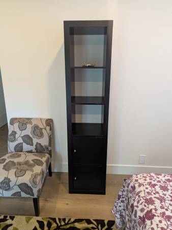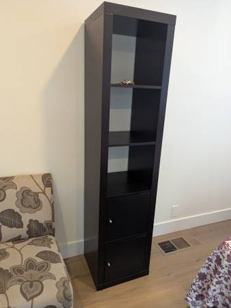 Ikea Kallax - Tall black bookshelf with multiple shelves and two lower cabinets. In very good condition.