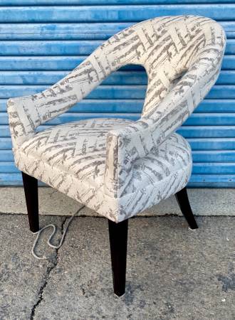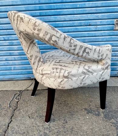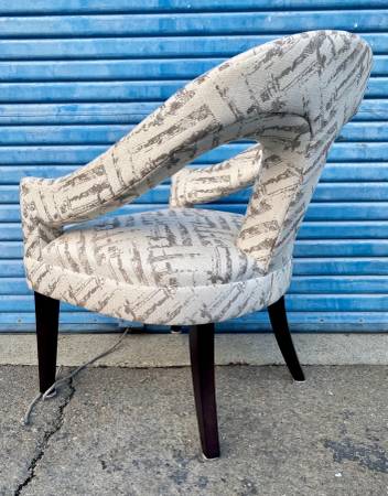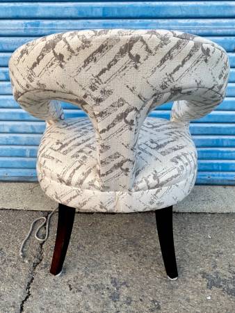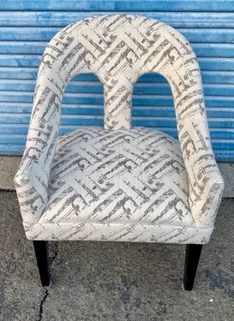 Orig asking $120, reduced to $95, NOW JUST $75 !!! Nearly new, cushioned, upholstered barrel chair, in neutral off-white, with light tan cross threads, and a soft grey, modern paraquet patterned...