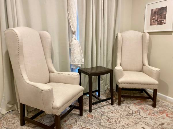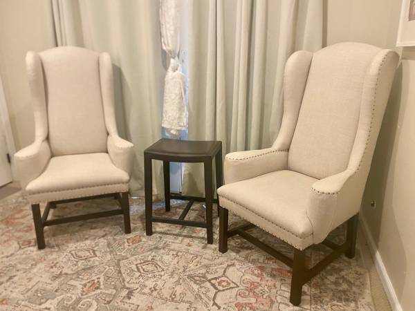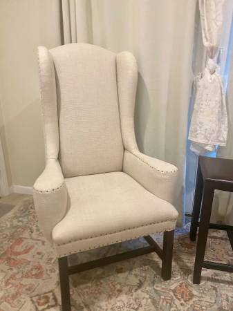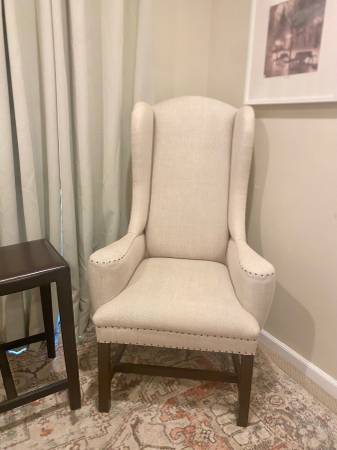 Pair of RH ( Restoration Hardware ) high back chairs with Belgian Linen upholstery in excellent condition . Asking $600 for both . Text ( 6 5O ) Two 8 three . 5 zero - 8 zero . Keywords #RH# Chairs....