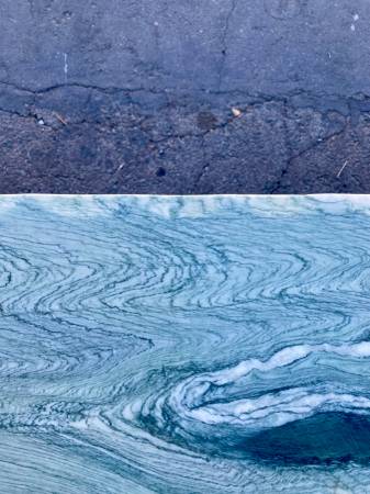 Truly unique, scallop edged green Granite table top, married to a deep red painted mahogany base, with matching ripple patterned skirt and legs.