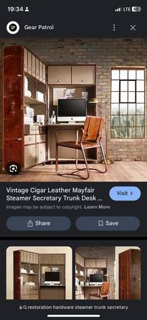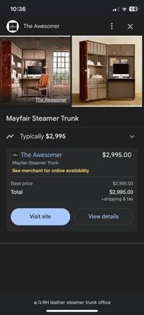 The Vintage Cigar Leather Mayfair Steamer Secretary Trunk Desk from Restoration Hardware was constructed by antiques dealer and furniture maker, Timothy Oulton of London. The reproduction steamer trunk is made by covering a solid wood frame in handmade distressed vintage cigar aniline-dyed leather and accented with 3,000 (yes, that many) hand-hammered brass nail heads. Open her up and you’ll find a pull-down desktop, myriad drawers, accessories cubbies, a bookshelves, and even a wire management system all lined in leather-edged canvas. Because it’s hand-made, each steamer trunk is unique in finish.
