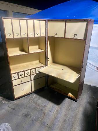Condition: 9/10; Pre-Owned/ Restored; I purchased from a 2nd owner, in very good condition, needing a thorough cleaning, greasing the file drawer slides and replacing a section of worn canvas linen, on the drop-down, desk area. Structurally, its super sound, fully functioning and a thrill to use!(Note: pics are of trunk pre-refinishing. Fresh pics are forthcoming)