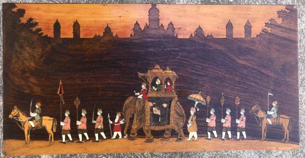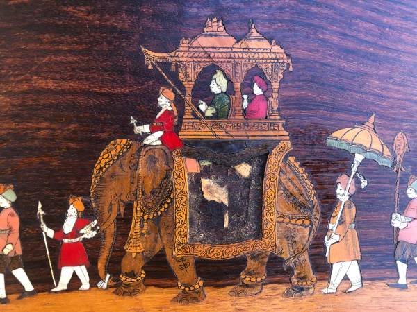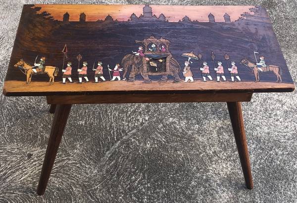 I've for sale one stunning, rosewood inlayed side table, portraying what looks like a figural procession that includes people, horses and an elephant. This wonderful piece has been in our family for decades, but now's looking for a new home. This solid, rosewood table is quite old so some of the exotic wood inlays has come off, especially on the elephant's belly. According to our mother, it was already like that when we got it. It can come with a nice, solid piece of glass, if you'd like. All in all, it displays beautifully. Please study the pictures and let me know if you've any questions. Thank you.