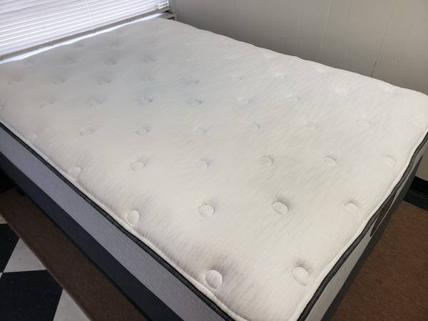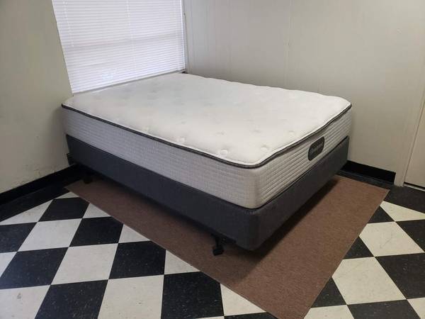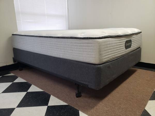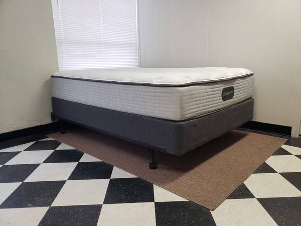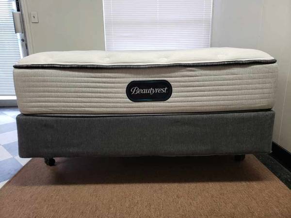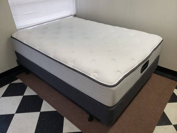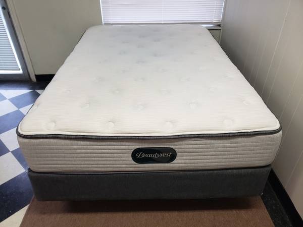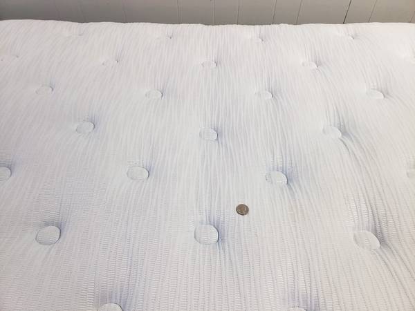Mattress is a quality BeautyRest brand, it has a couple of tiny barely noticeable spots and a light area of color transfer from a dark sheet it had on (please see all photos), a nice sheet should cover those insignificant cosmetic imperfections.