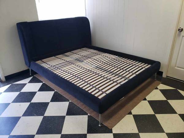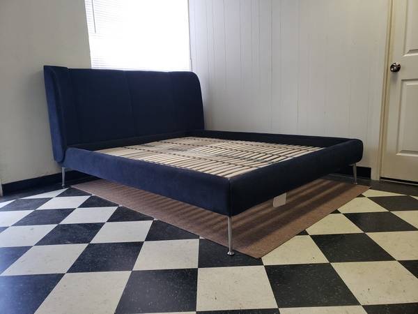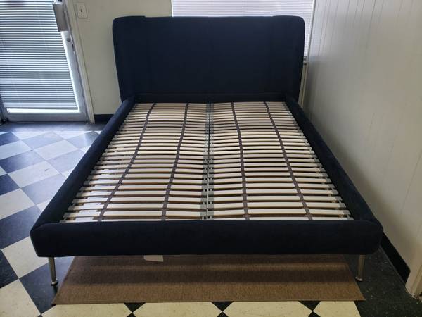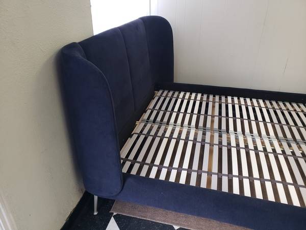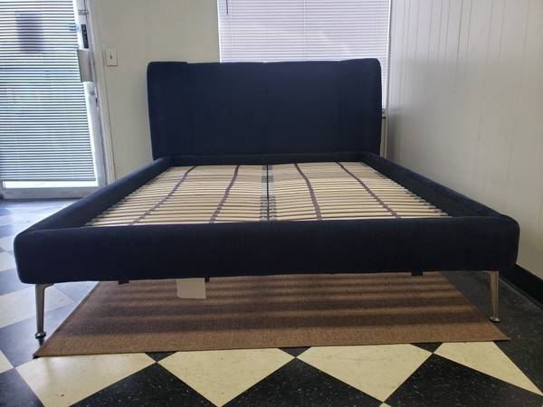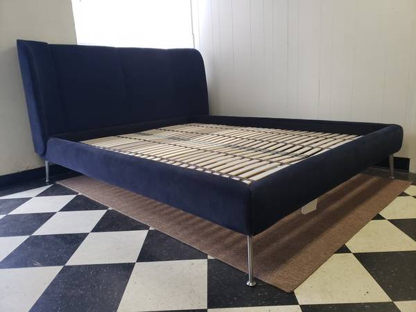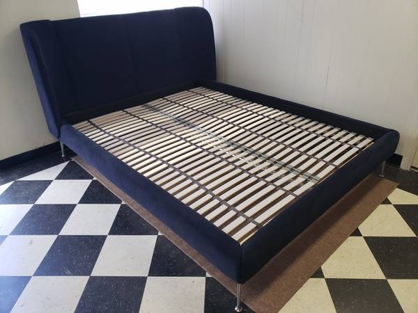 Beautiful upholstered platform frame consists of a curved headboard, foot board, side rails, middle metal center support and wooden slats cross bars foundations supports.