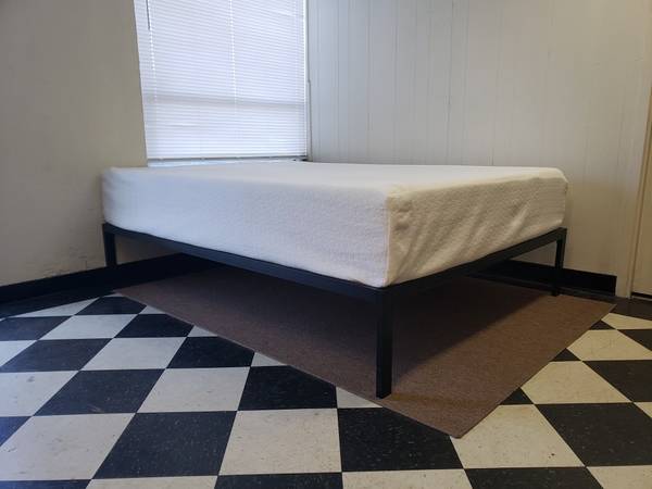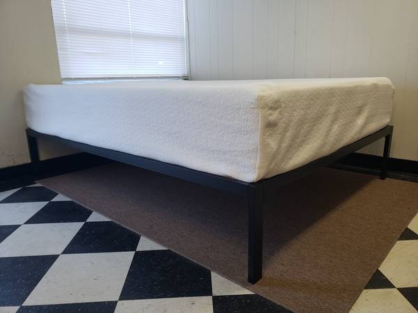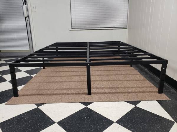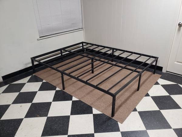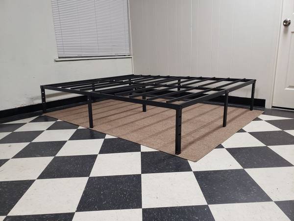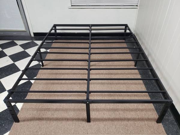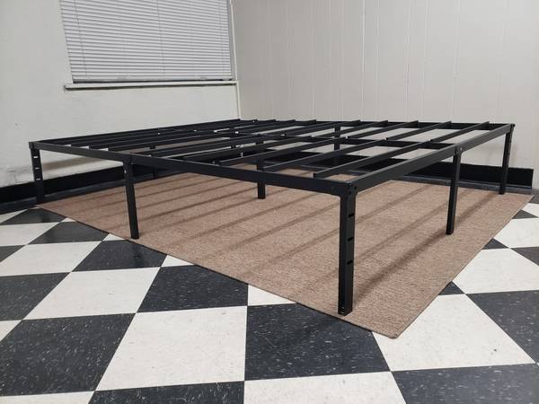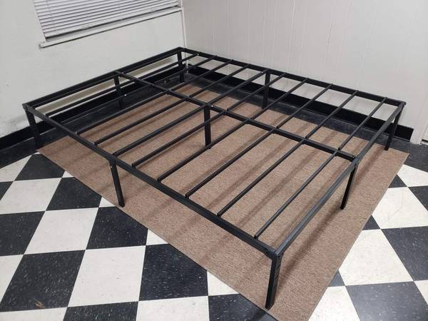 Simple black platform bed frame consists of no tall headboard / foot board, side rails, middle support with center legs supports and metal slats cross bars foundations, it also has a 12.5" storage clearance space under, perfect to store luggage bags or small boxes / plastic bins, no box spring foundation required.
