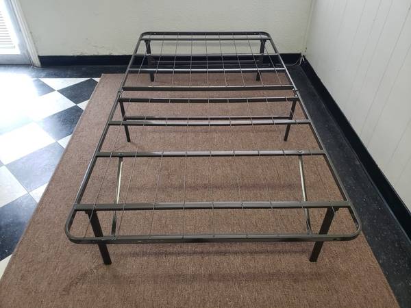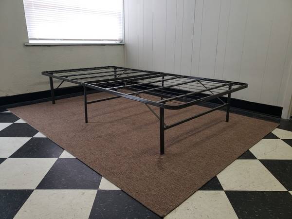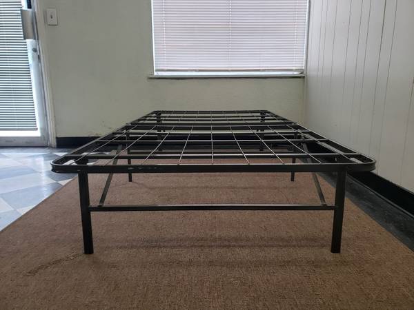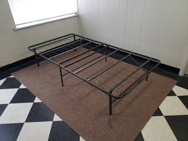 Simple black bed frame consists of no tall headboard / foot board, side rails, middle support with center legs supports and metal slats cross bars foundations, it also has a 12.5" storage clearance under, perfect to store luggage bags or small boxes / plastic bins, no box spring foundation required.