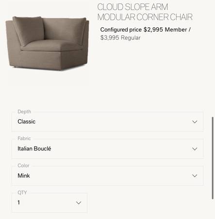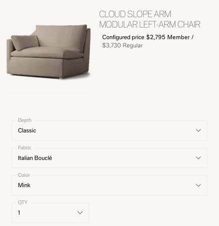 I’m selling this Beautiful RH Cloud Couch. It’s the Slope Arm Classic size. I have a lot of these pieces I’ve used for staging, so these are in really good condition. This is my newest set!