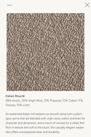 It’s 10’ on the longer side and 6’8” on the shorter side. The color is Called Mink and the fabric is Italian Boucle.