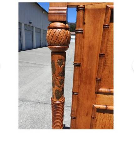 Aesthetic Movement birds eye maple faux bamboo full sized bed frame by R. J. Horner circa 1870s-1890s. Rare oriental style with dragon heads, gold leaf floral elements, intricate overlay and pineapple details.
