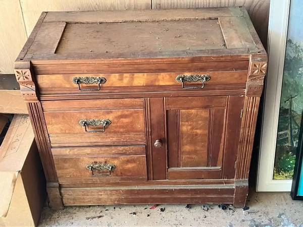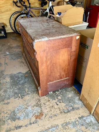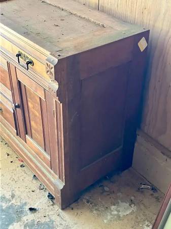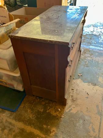 Circa 1890 carved mahogany dresser and washstand set. Good original condition. The dresser has its original brown marble top. The washstand is missing its top. Both have flamed maple (?) veneer...