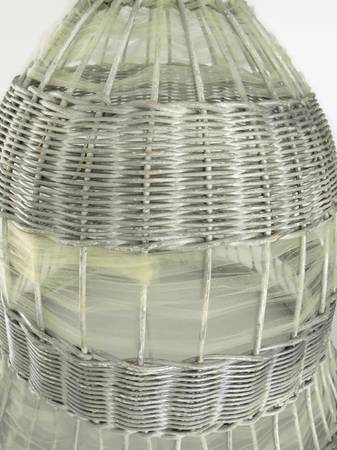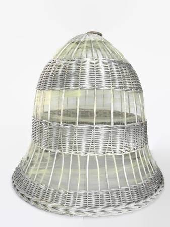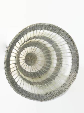 Antique large wicker bell in silver-white color with pale yellow organza net lace inserts for indoor decor in shabby chic, granny chic, or boho chic styles. The bell was likely a florist window decor. It can be turned into a pendant shade, repainted, or decorated with new fabric or lace matching the room color palette, or used as is. It is clean, with no damage to wicker or lace, with weathered paint (see photos). The bell was made by Art Rattan Works (Oakland). Rare piece.