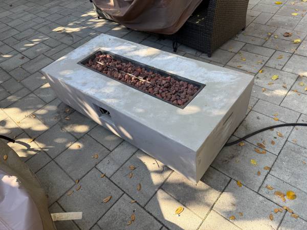 This firepit is several years old but we've always kept a cover on it and it still works just fine. It has a "concrete" look but the material is some kind of composite, it's not actual concrete, so it's not that heavy. Two people can lift it easily. It's about 27” wide by 57” long by 15” high, and it has a separate little cube thing that's actually the cover for the gas tank (see photos) which is 16” x 16” x 21” high and works well as a little side table.