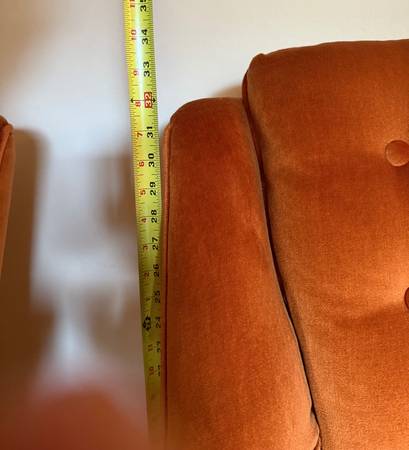 Pair of vintage orange rocking armchairs Each chair is 34” tall, 34” deep, 30” wide. The depth of the seat area is 20”.