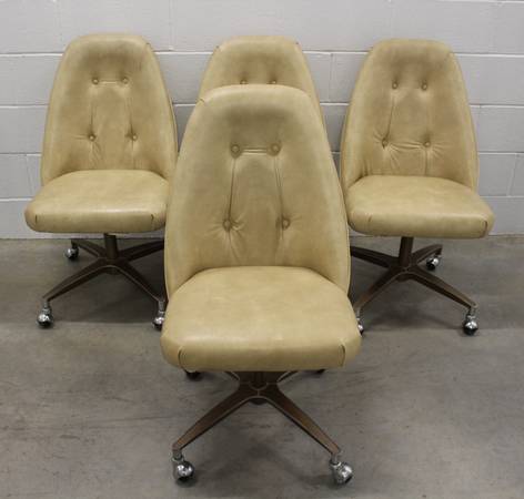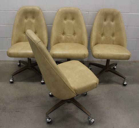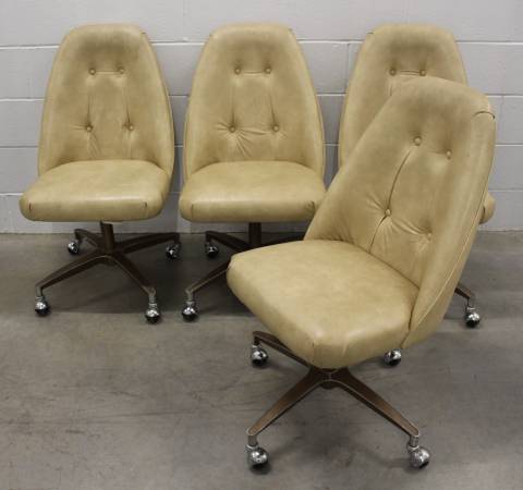 The base of each of the chairs is expertly crafted of die-cast aluminum with a four-star swivel design. All four chairs swivel 360 degrees and all of the casters easily roll as they should. The chairs feature elegant lines and measure 20” x 24” x 35” with a 17” seat height and 16” seat depth. The chairs are upholstered in their original tufted Naugahyde in excellent condition with no rips or tears.