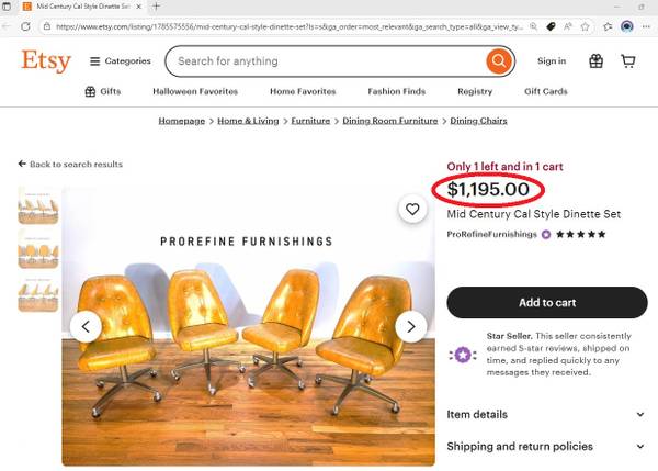 Similar sets go for $1195 + Tax + Shipping or Delivery at vintage stores, antique shops, 1stDibs, Chairish, Bonhams, Christie’s, and Sotheby’s.