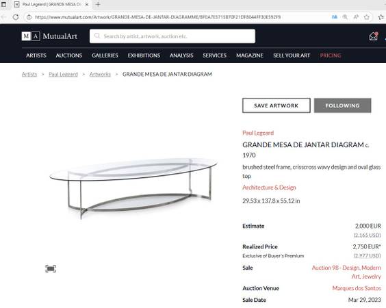 Similar vintage Paul Legeard coffee tables go for over $1,400 at vintage stores, antique shops, 1stdibs, Bonhams, Chairish, Christie’s, and Sotheby’s. See screenshots of comparables.