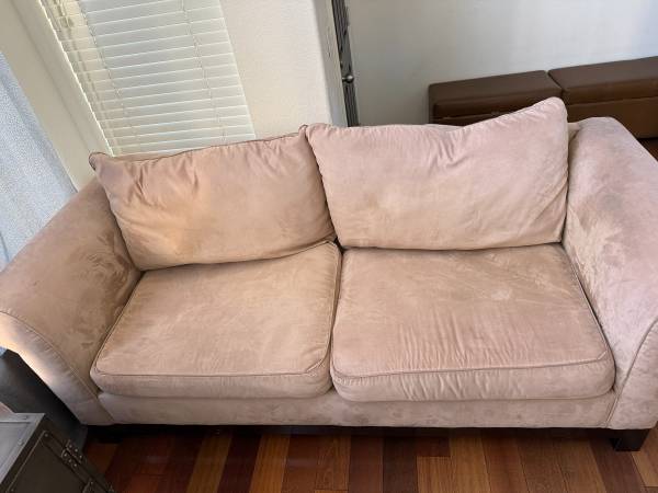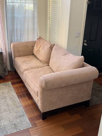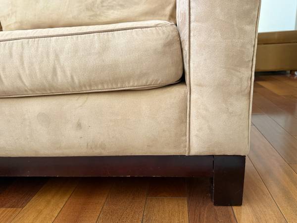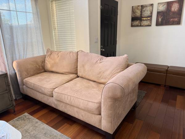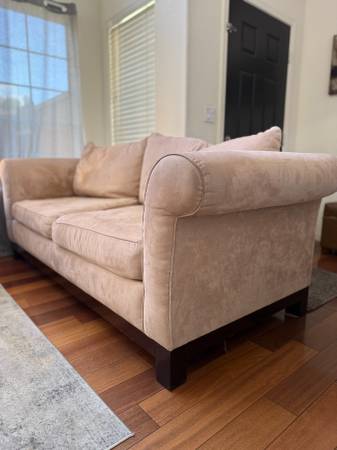 Classic, traditional design, featuring rolled arms in a camel suede fabric, reversable foam cuhions with stuffed back seat cushions. Easy to clean . comfortable and inviting. 87"Lx 38"D x 31"H - 19"...