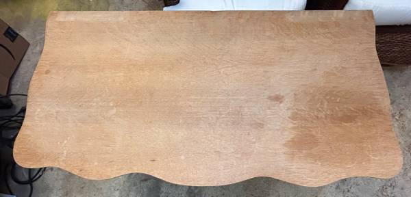 Antique wooden dressing table from the 1920s with tilting mirror. Two drawers with original hardware. Curved legs and decorative details. Natural wood finish.