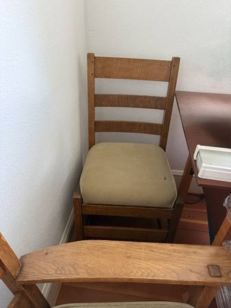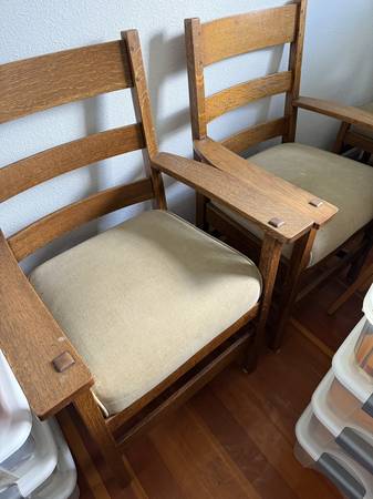 Solid Oak arts & crafts style dining furniture. 2 arm chairs and 5 chairs. Leafs to extend table.