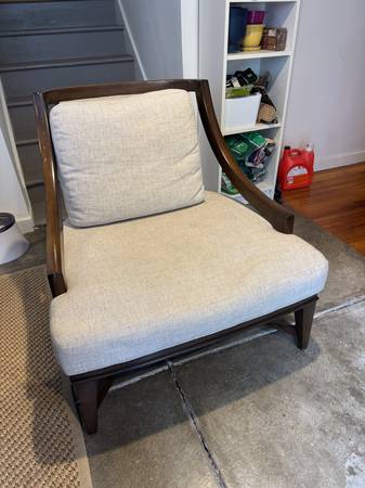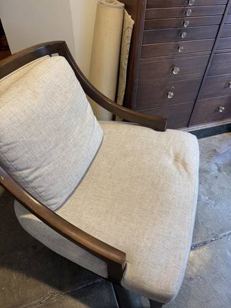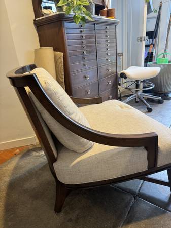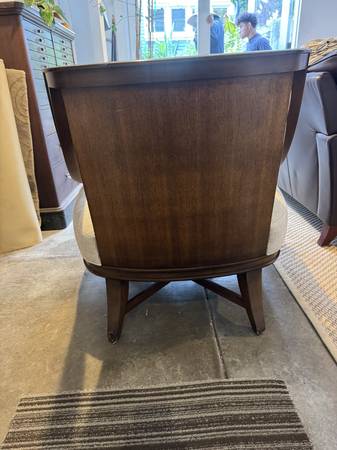 Beautiful solid wood framed lounge chairs with exposed back in dark Havana finish with custom ivory fabric upholstered front and loose back cushion. $500 each, sold separately or $1000 for the pair.