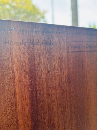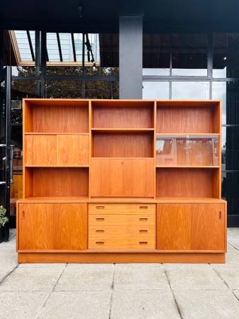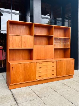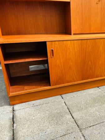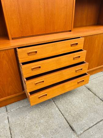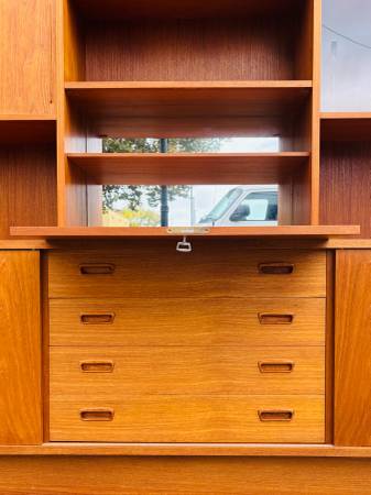 A mid century Danish teak wall unit. Produced by Hornslet Mobelfabrik. Features a variety of open and closed storage with a flip down mirrored bar cabinet in the center.