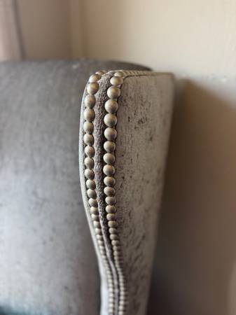 Selling this stunning high-back accent chair in a luxurious silver/gray velvet fabric with beautiful brushed silver nailhead trim. It’s a statement piece that’s both glam and comfortable!
