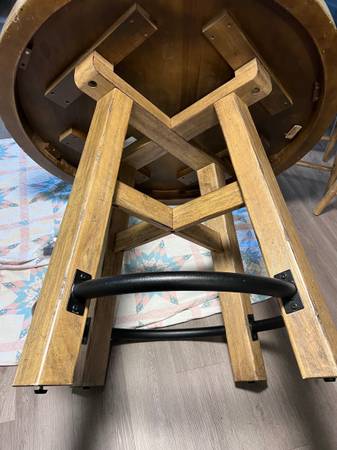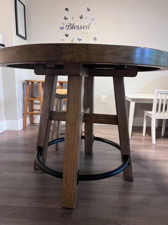 High Quality Meridian Furnitures Solid Oak 46”Rustic Round Bar Height Dining Table. Stools are Not included Set of 4 Stools available available for sale separately. Both are Very Good Condition.