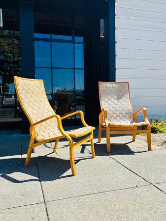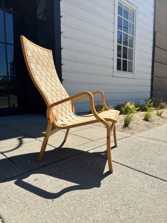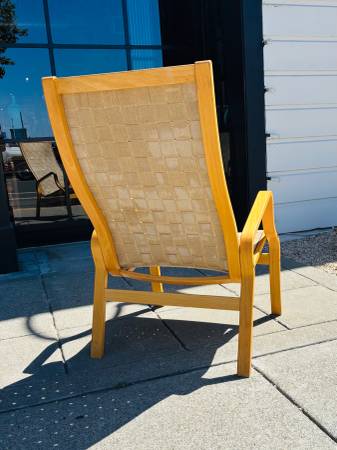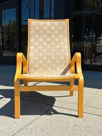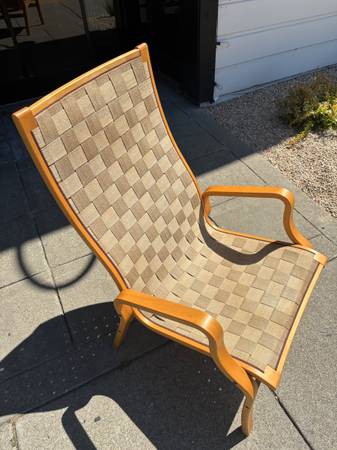 A mid century Danish "Albert" lounge chair designed by Finn Ostergaard. Features a contoured bent beechwood frame and woven canvas upholstery. 2 are available for sale separately for $850 each.