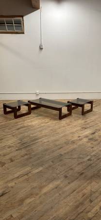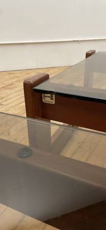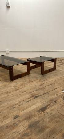 $2250 or best offer. 1970s Percival Lafer MP 97 Coffee and side tables. Made in Brazil. Jacaranda wood and smoked glass tops. Missing few bumpers and one glass chip in two tables. Can help guide you to replacement glass if you desire.