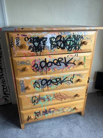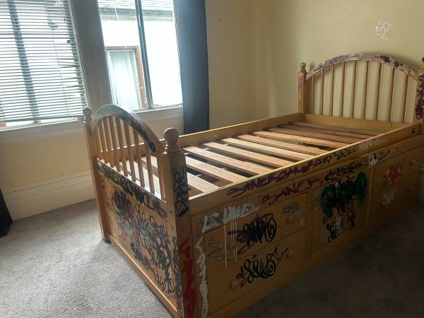 Solid wood, pine, twin bed with storage drawers and tall boy dresser. Kid covered the pieces with graffiti, so they need to be repainted or refinished but otherwise in good working order, drawers...