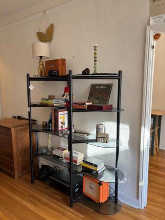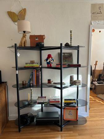 Urban Outfitters Retro Glass Bookshelf. Glass pains lift off and metal shelving can be split apart for transport
