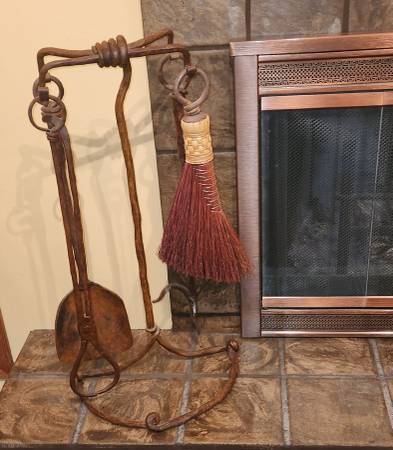 Designed and meticulously handcrafted by Christopher Thomson, a renowned blacksmith from New Mexico, in his studio located northeast of Santa Fe. Crafted for durability, this hand-forged iron fireplace tool set is built to withstand the test of time. Consisting of four essential fire tools – a poker, broom, shovel and tongs – it also features a sturdy forged iron tool stand. Available in Poquito size: Overall Height 30”; Tools: 26”