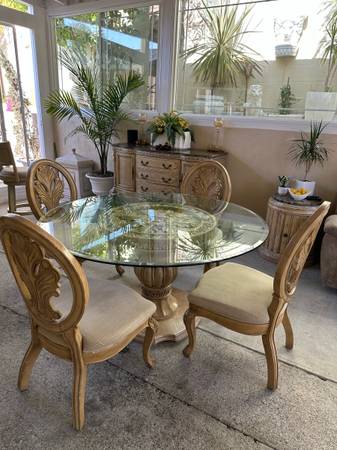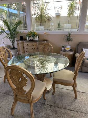 Vintage dining table with 6 chairs. Two with arm rest in good condition. Very heavy duty & glass table top