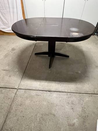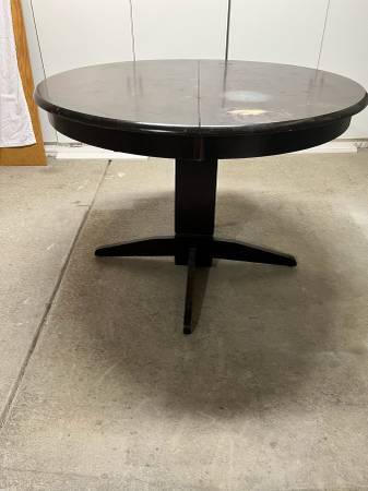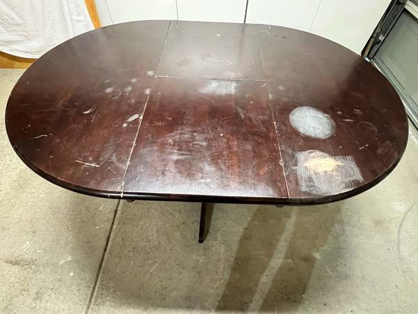 Used 42” round hardwood table with extension leaf inside table. Expands to 61”x42”. 30” Height. Needs work, perfect for the do it yourself person!