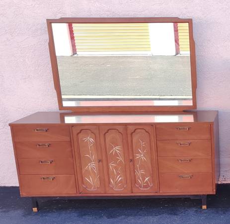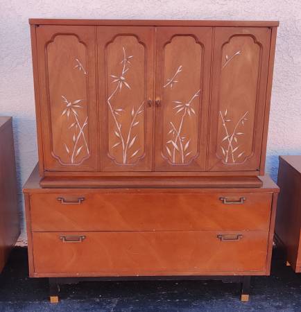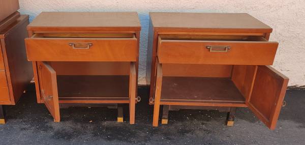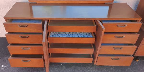 Bedroom Set Dresser High Boy Mirror Bureau Nightstands Broyhill Premier Edition Matching Mid Century Modern Set Wood Guides on Wood Runners Dovetail Drawers Needs refinishing, signs of use with...