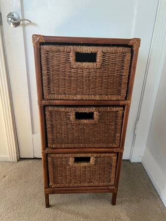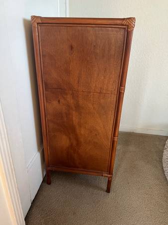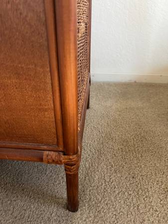 Excellent condition Made in China. This piece is constructed with plywood chassis, bamboo and rattan. Has three drawers and is a stunning addition in any bedroom.