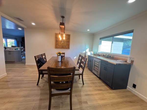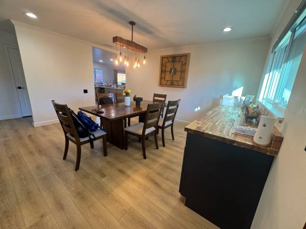 Stylish and sturdy, this modern dining set is perfect for family meals or entertaining guests. The set includes six comfortable chairs and a sleek, durable dining table in good condition.