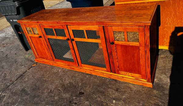Modern Mission TV Stand/Entertainment Center top is faded probably needs to be painted or refinished. Has glass shelves not pictured. 73 3/4” W X 30 1/4” T X 20 1/2” D. Cash only I do not deliver or...