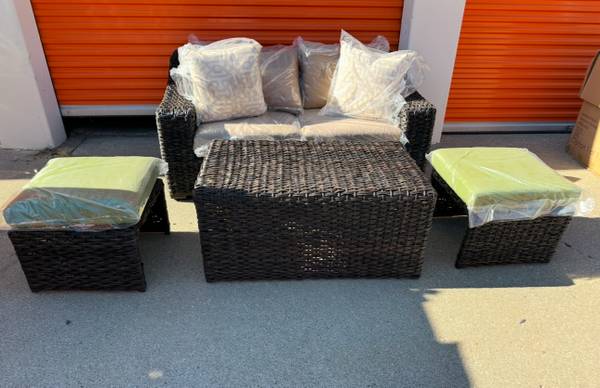 Comes new in box plan deliver for a fee or pickup. Loveseat consists of 2 pieces, coffee table, and 2 stools, sunbrella fabric cushions pickup in Pleasanton or can deliver for extra. Email or call