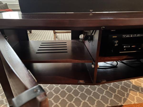 TV credenza (all wood) from Sligh with SmartEye and Strong Arm. SmartEye allows remote control of electronic components stored behind closed doors. StrongArm is an adjustable height flat panel TV mounting bracket (removable). Umber cherry finish, 2 door, back is vented for heat control, adjustable shelves.