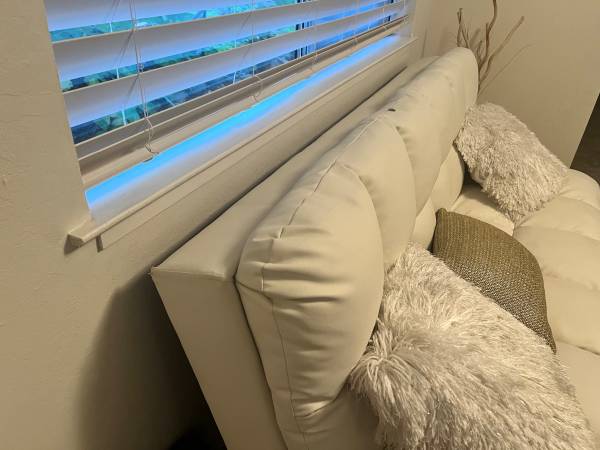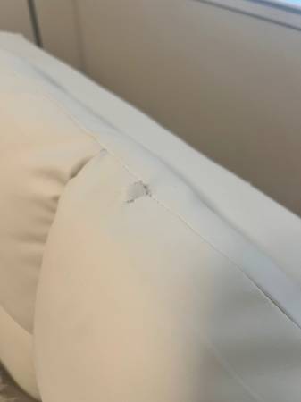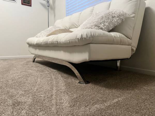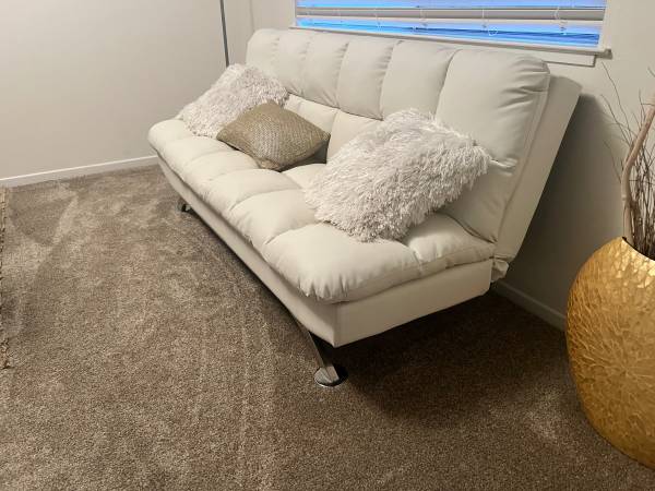 A gently used bonded leather white sofa that unfolds into a full bed. Cushiony and comfortable; sturdy and easy to care for.