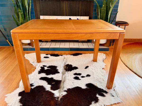 For sale is a Danish Mid-Century Modern teak side table by most likely made by Vejle Stole & Møbelfabrik. It features solid teak wood with a framed staved surface and bull-nosed corners and legs. The table was likely manufactured in the 1960s or 1970s in Denmark. It is well-constructed and sturdy, with a clean, minimalist design.