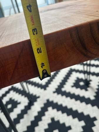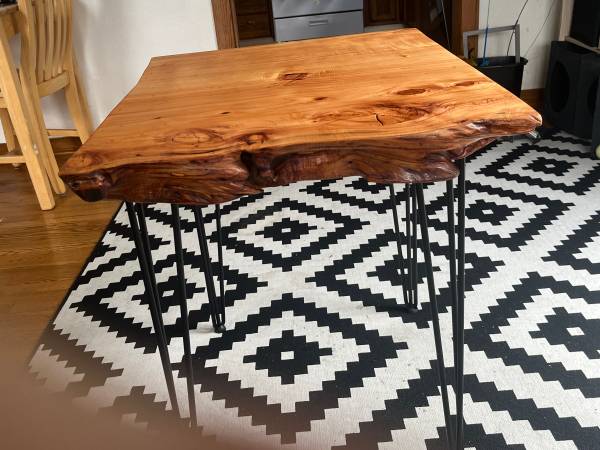 Live edge, Monterey Cypress table sitting on some hairpin legs. 4 coats of hand rubbed tongue oil. 31x23x 27H 2.5" thick $300/OBO if the ad is up, it's available