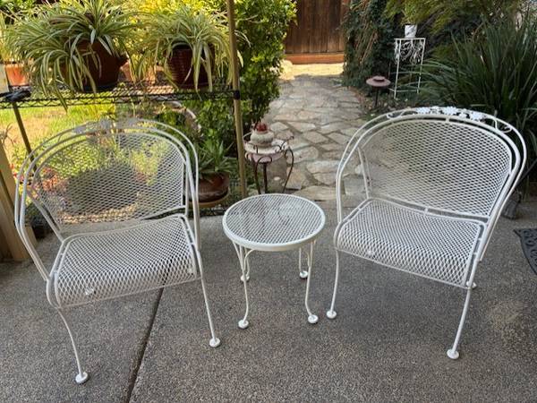 2 Wrought iron metal patio chairs with side table . Excellent condition 26" w x 28" d x 31" high. Seat is 18" x 16" x 17" high Floral design on the backrest. Asking $ 395 Firm on price, Cash only...