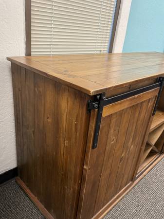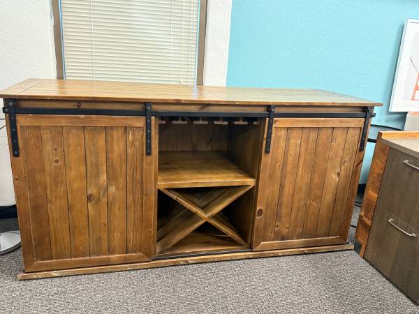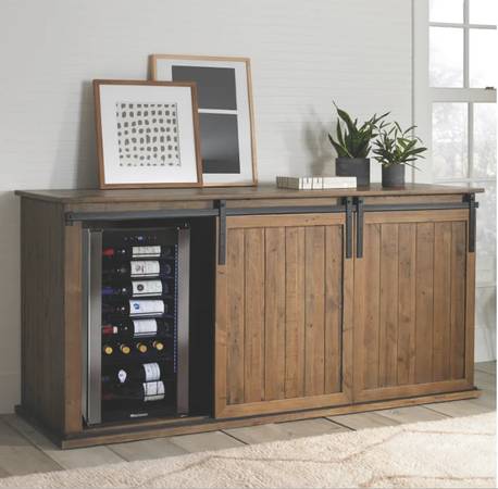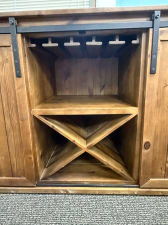 A customizable wine credenza with several options to suit your needs, handcrafted from reclaimed pine and black powder coated iron
