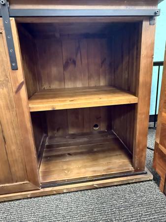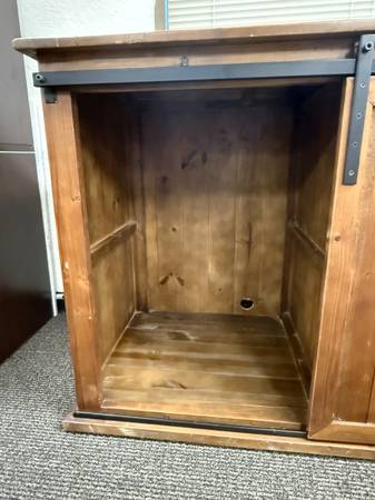 Double sliding barn style doors conceal and reveal storage for an always-elegant look