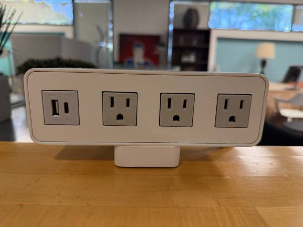 Power Station, Desk-Edge Mount. Finished on all sides, this hub features 3 electrical outlets, and 2 USB outlets. Power cord reaches 10'.