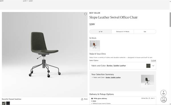* Fabric and Color: Banker, Saddle Leather